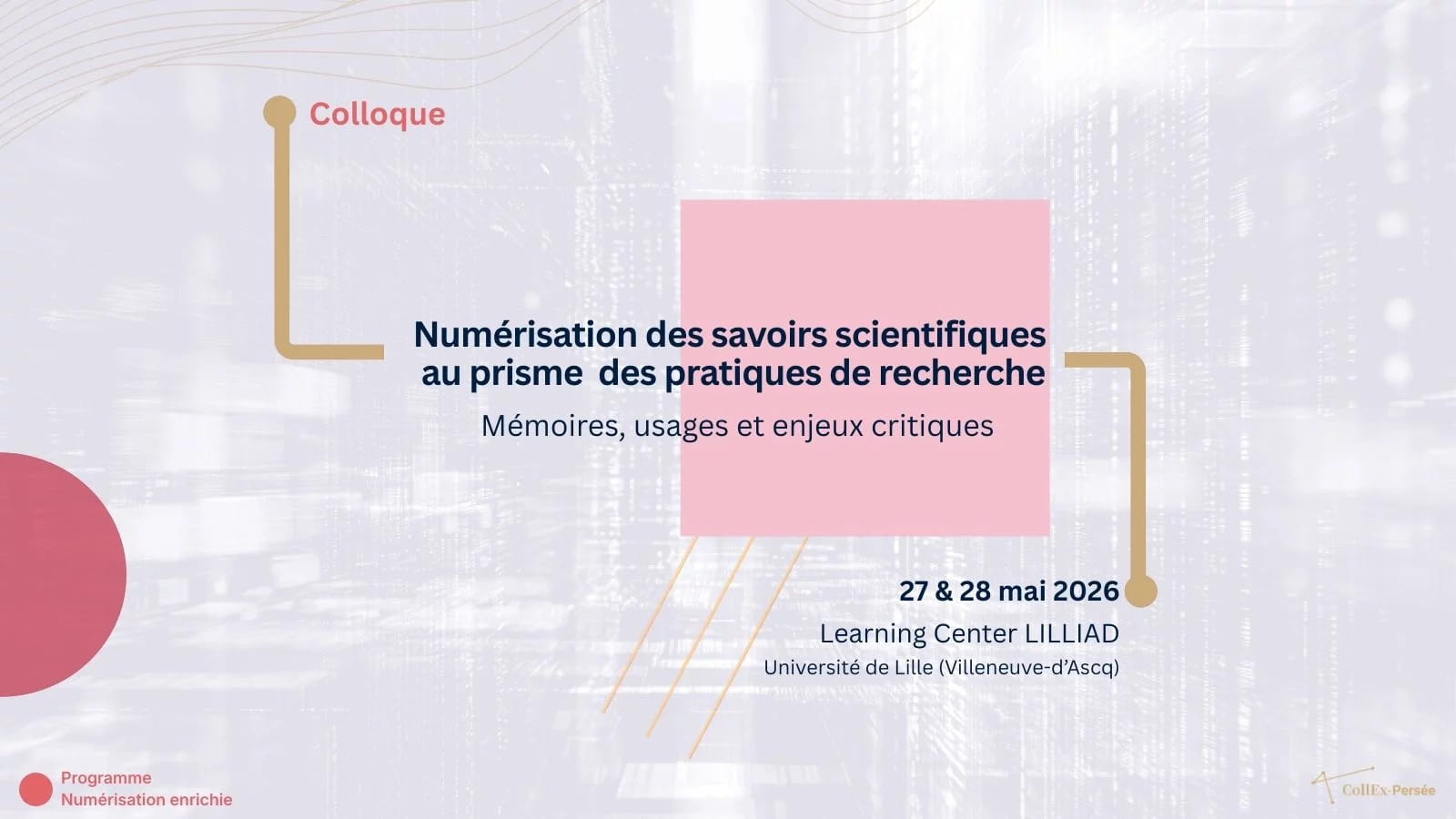 Ce colloque, organisé par le programme Numérisation enrichie de CollEx-Persée, les 27 et 28 mai 2026 au Learning Center LILLIAD (Université de Lille, Villeneuve d’Ascq), proposera une réflexion critique, collective et interdisciplinaire sur les transformations induites par la numérisation dans les pratiques de recherche et les usages scientifiques.